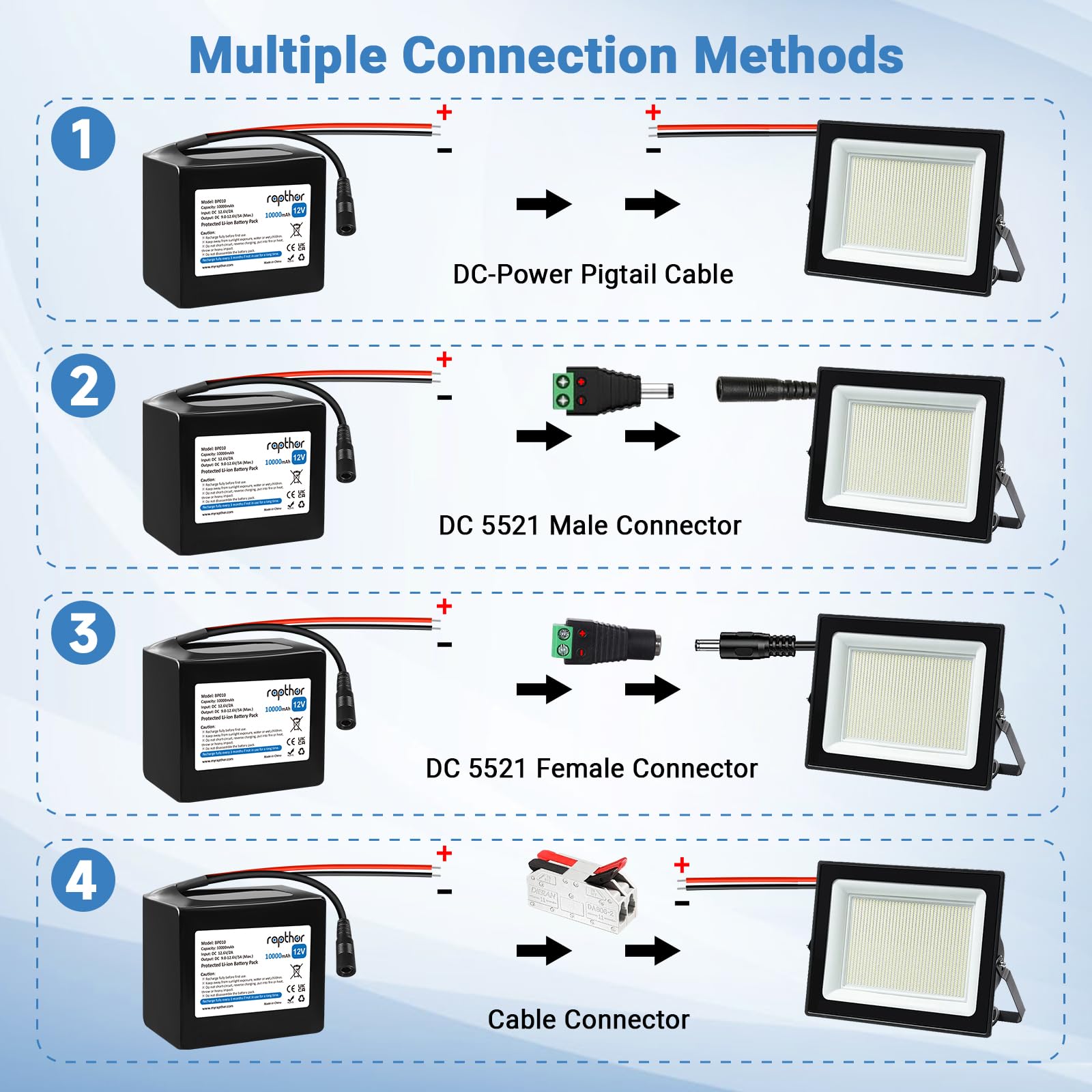 Compatible with CCTV camera, IP camera, RC car, LED panel, amplifier, modem, walkie-talkies, camcorders, aviation models, LED strip, electronic piano, optical network unit, router, car DVR and other 12V devices.