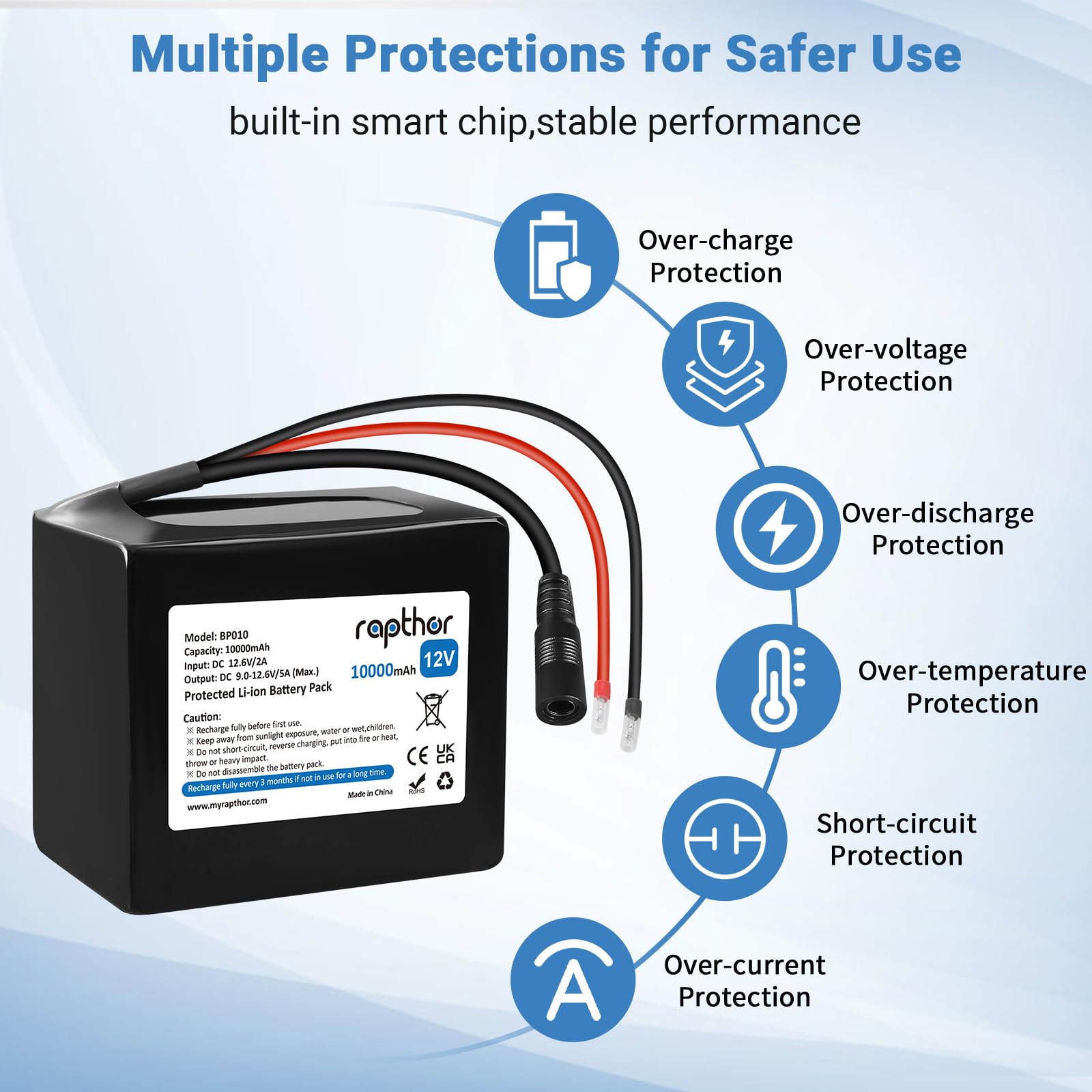Rapthor Rechargeable 12V 10000mAh Lithium ion Battery Pack with 12.6V 2A Fast Charger for 12V Devices with DC5521 Port, DIY Project, Router, Radio, LED Light Strip, CCTV Camera, Telescope (Model: BP010)