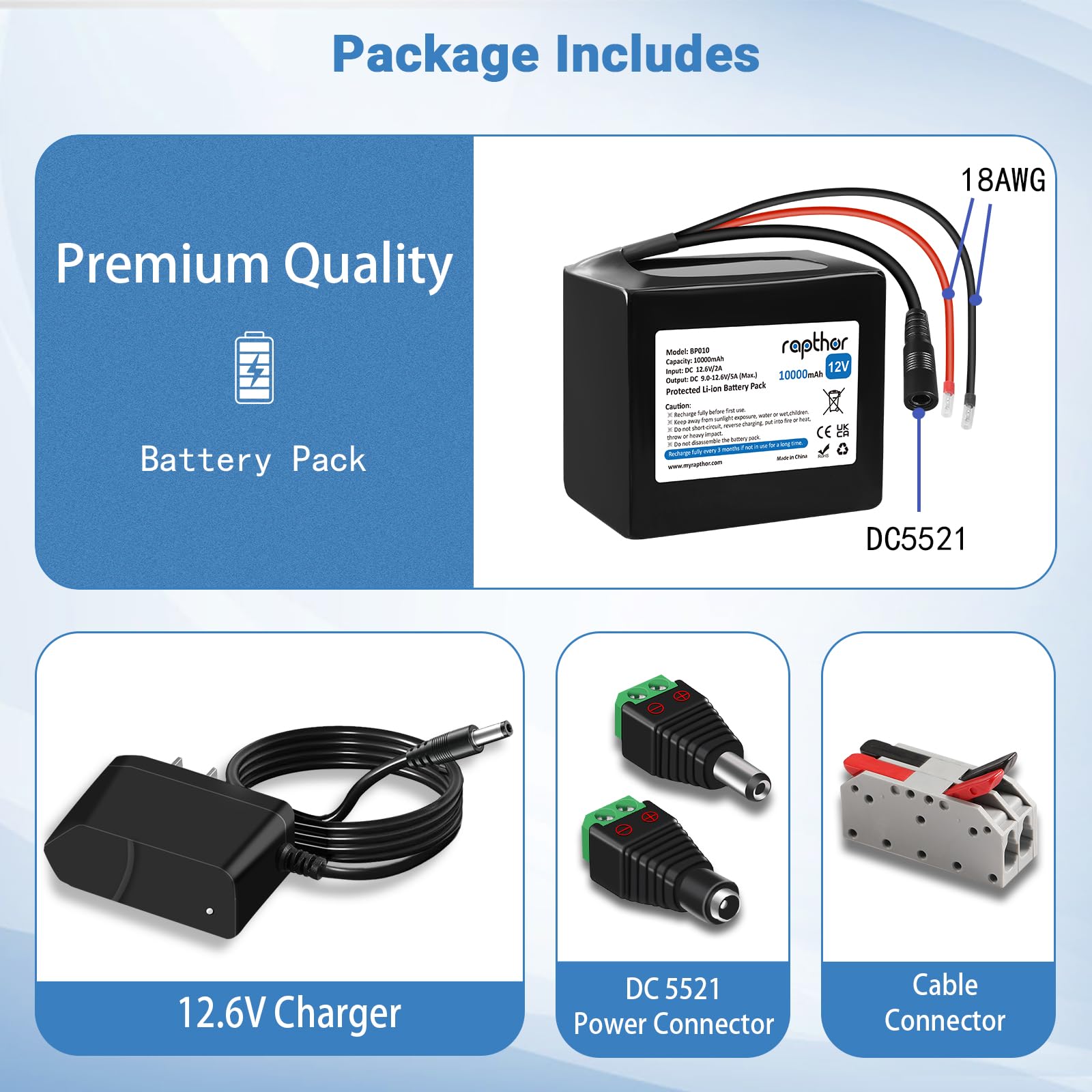 This 10000mAh lithium ion battery pack with DC 9.0-12.6V/5A (Max) output, the input is DC12.6V/2A. It comes with 12.6V/2A Charger, DC 5521 female and male connector and cable connector, great choice to do the DIY projects.