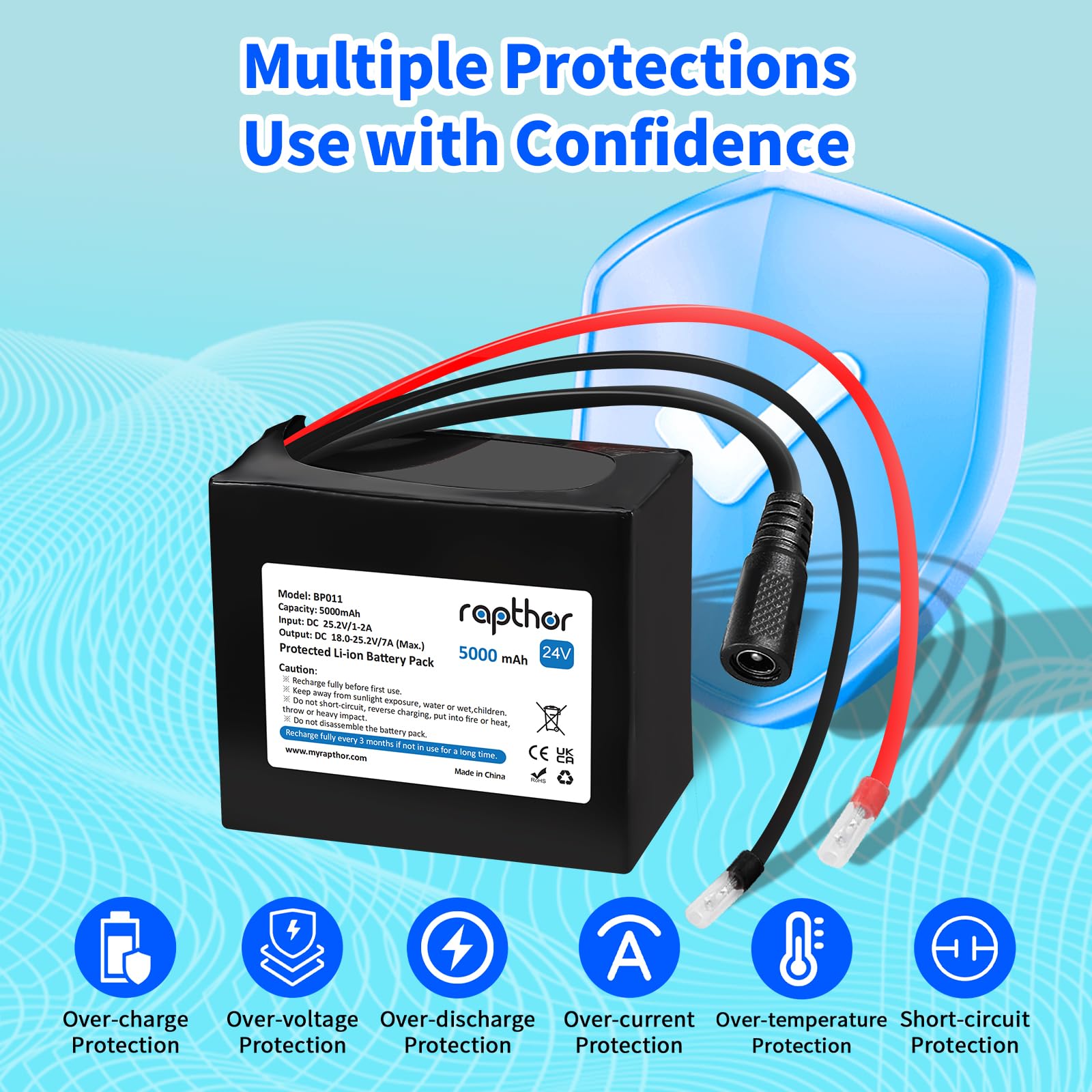 rapthor 24V 5000mAh Rechargeable Lithium ion Battery Pack 24 Volt 5Ah with 25.2V 1A Charger for DIY Projects (Model: BP011)