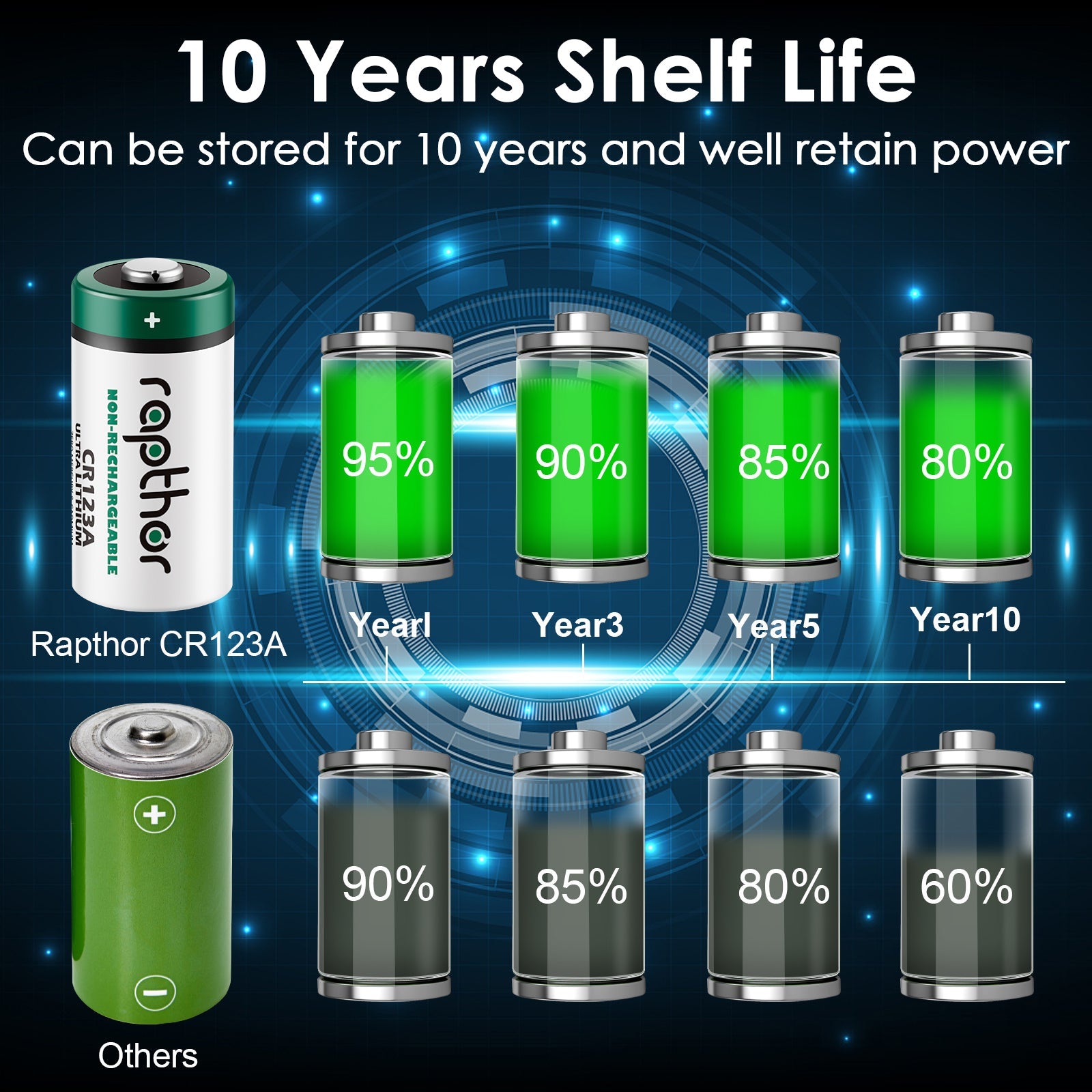 Rapthor CR123A batteries provide dependable performance in flashlights, digital cameras, digital camcorders, smart home devices, alarm sensor systems, electric toys and more.